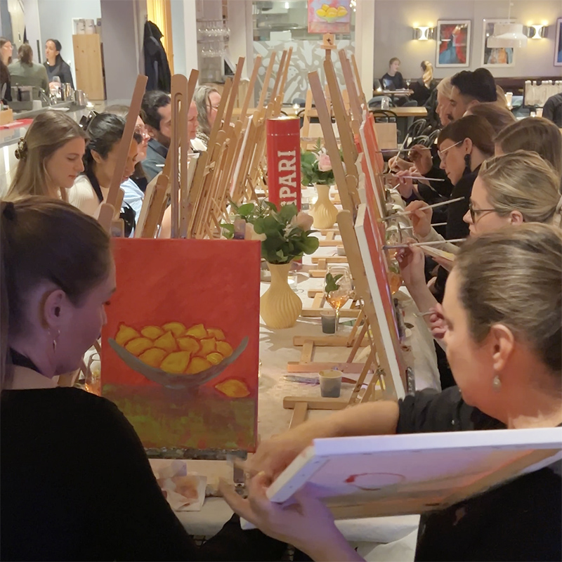 Under ledning av en konstnär på plats guidar vi dig steg för steg genom kvällens motiv. Ingen erfarenhet behövs. Inga krav. Inget konstnärs-ego. Bara färg, musik, skratt och något gott i glaset.